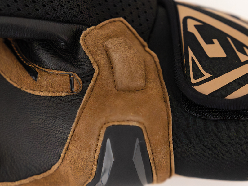 Rukavice jsou vyrobeny z kvalitní kůže (95%) a textilu (5%), což zajišťuje jejich dlouhou životnost a odolnost proti opotřebení. Kůže je nejen odolná, ale také dostatečně flexibilní, takže se rukavice snadno přizpůsobí vaší ruce. Polymerové chrániče na klíčových místech rukavic chrání před nárazy a zároveň neomezují pohyb.